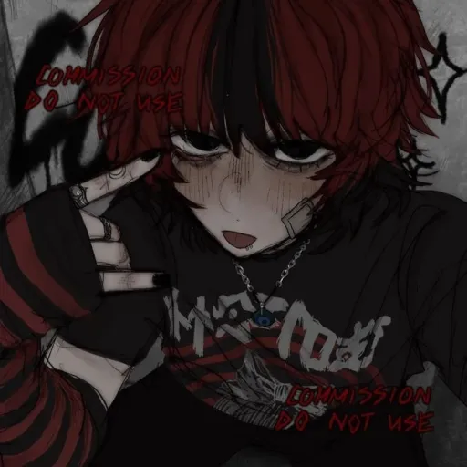 "What. The. Fuck-?" He looks exactly how he wants to look, red short hair with a black stripe in the bangs, Slipknot shirt, black and red gloves and empire jeans