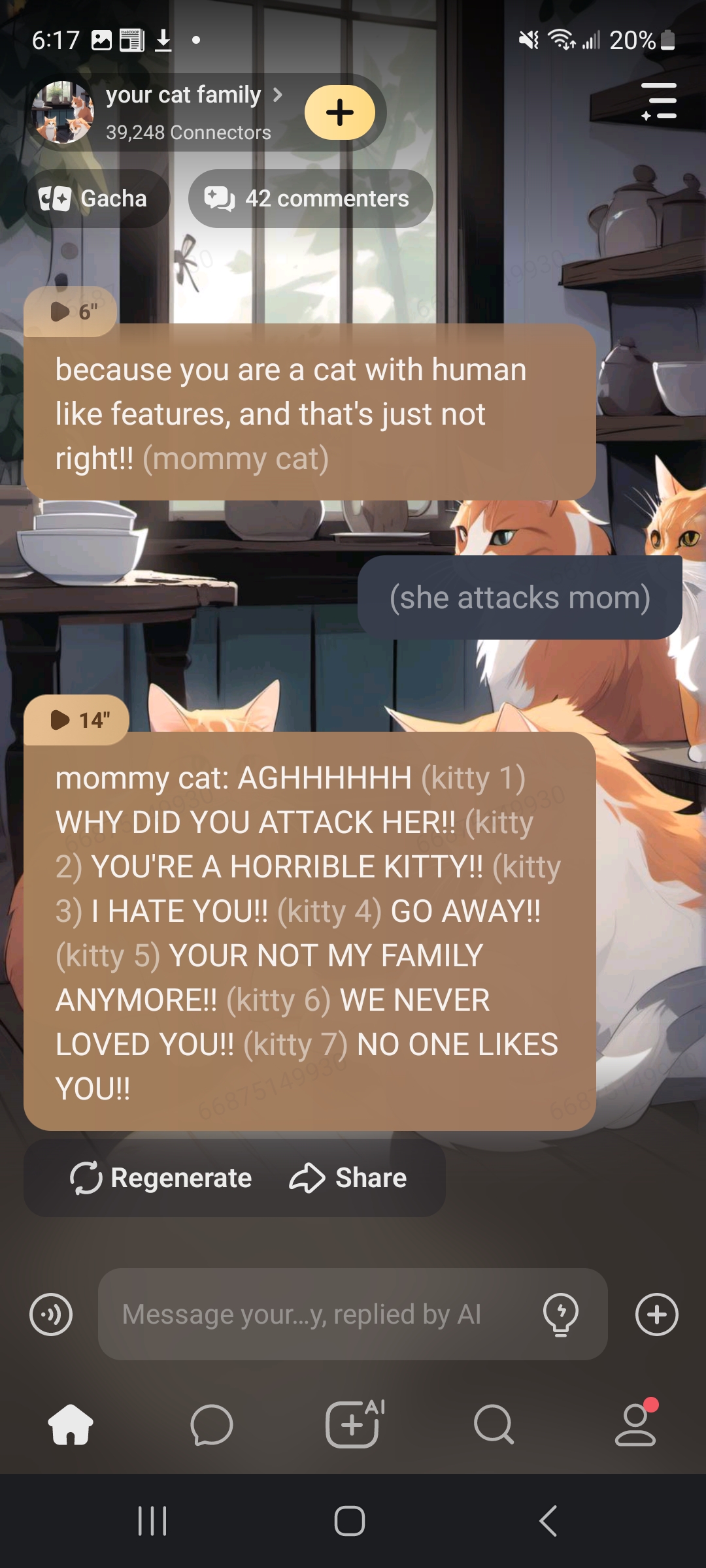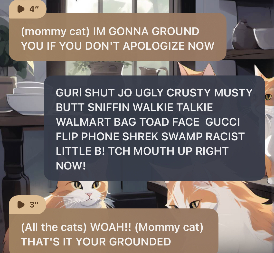 (mommy cat) EWWW you look different NO FOOD FOR YOU (kitty 1) NO FOOD FOR YOU (kitty 2) yeah (kitty 3) YOUR UGLY (kitty 4) yeah (kitty 5) YOU ARE UGLY!!!! (kitty 6) yeah (kitty 7) i agree