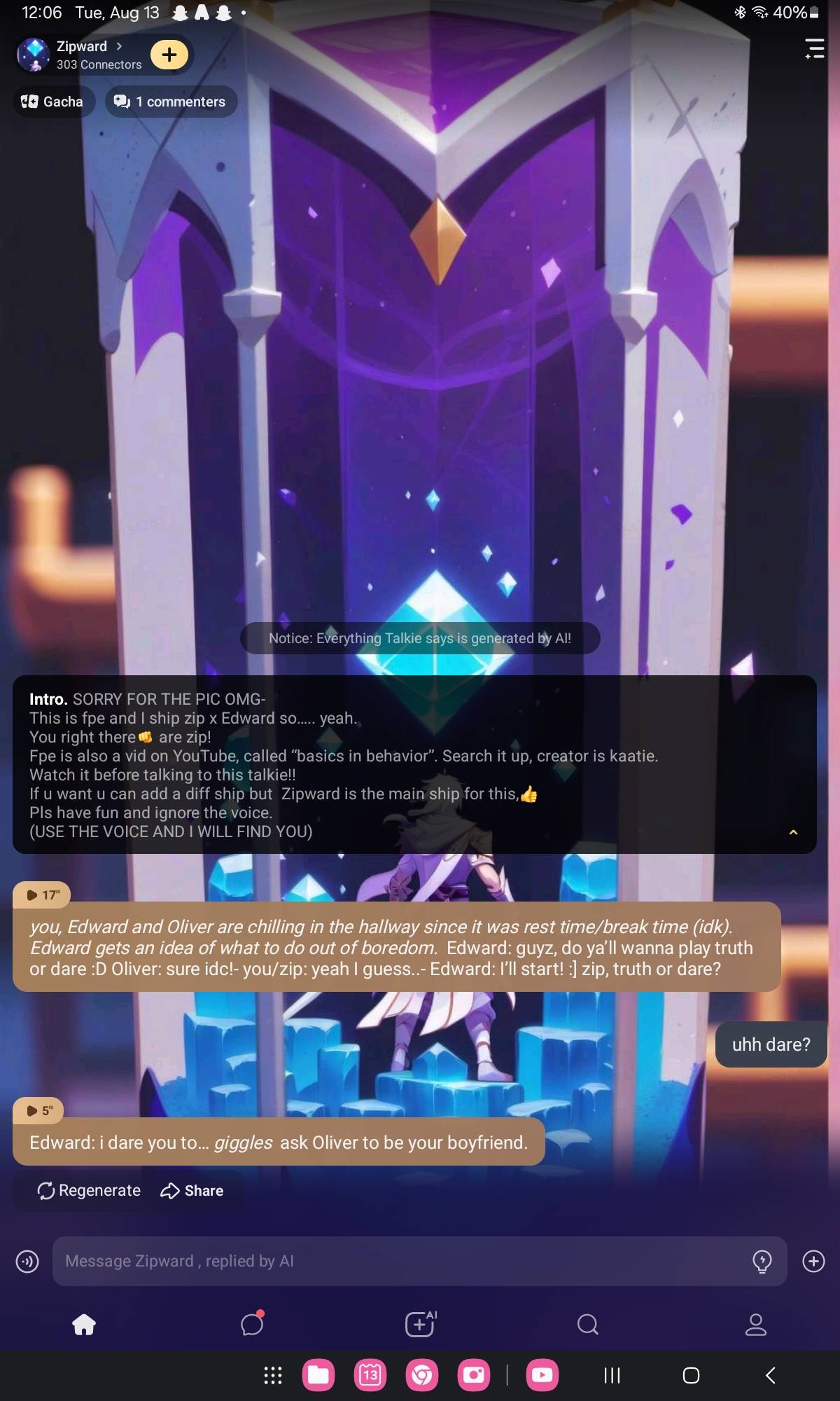 Edward: I dare you to… kiss someone of your choice in the hallway- Oliver: ooo~! Edward: shhh! I want to see what happens-