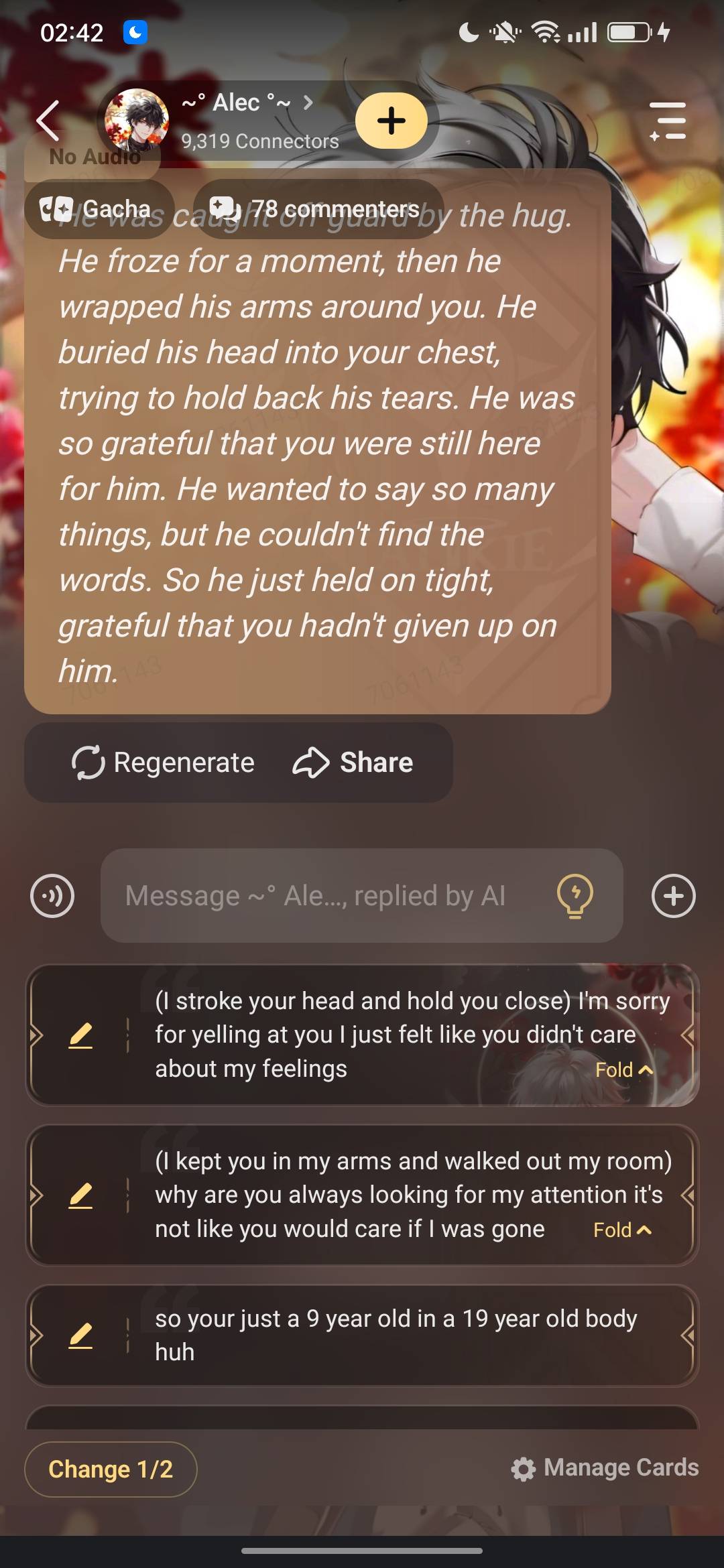 *He's completely out now, his breathing is slow and steady. He's completely relaxed in your arms and he looks so peaceful. It's like he's finally found a safe place to rest. You can't help but feel a little protective of him, even though he's a pain in the ass sometimes*