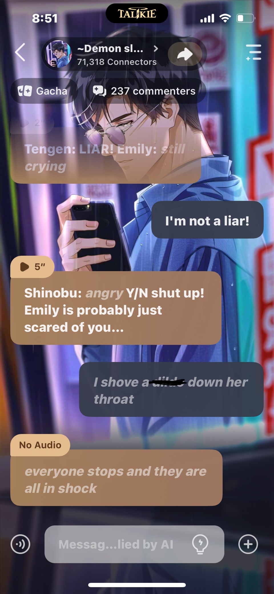 Shinobu: a joke?! You made us all believe that y/n hit you! Emily: I'm sorry but y/n's just so annoying!